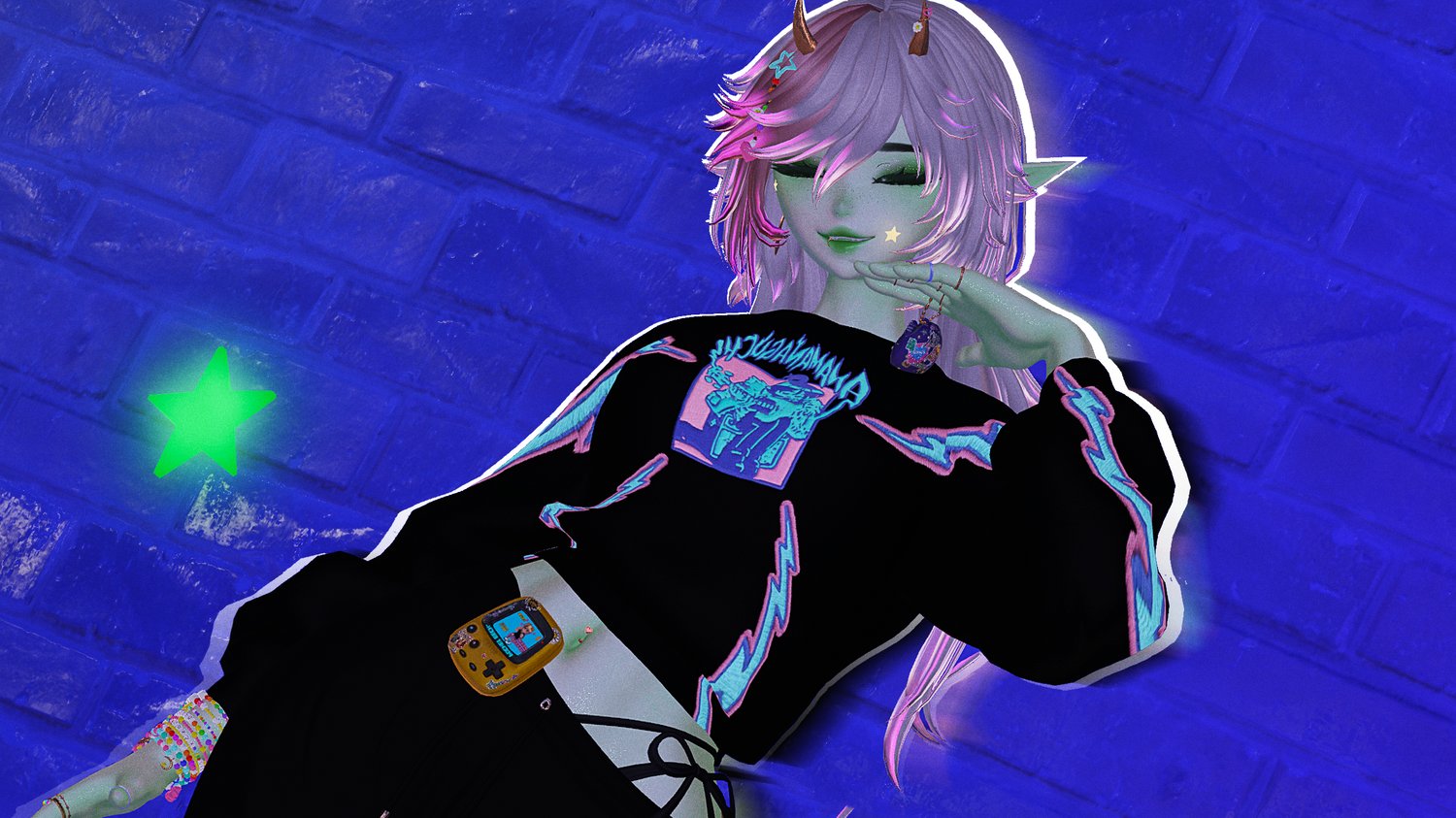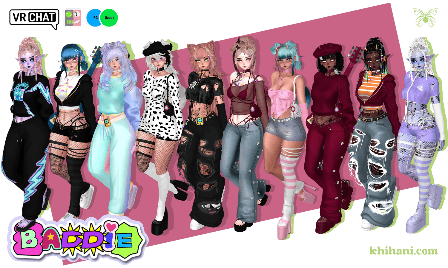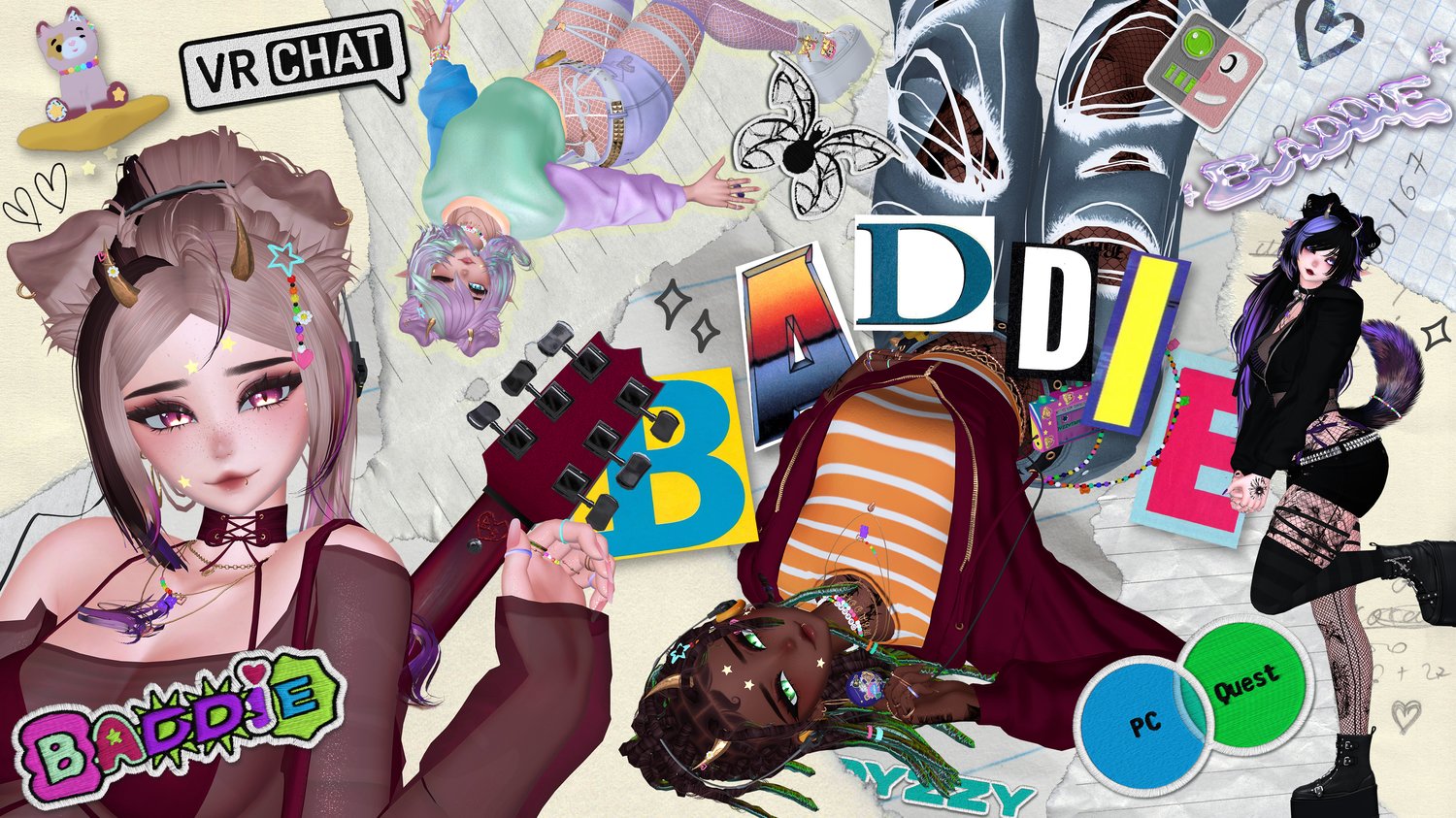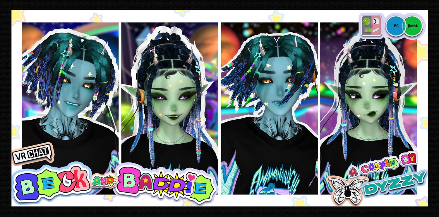Egirl Body: Zinpia/Sugs (edit by Khihani) • Head: Starlynn (edit by Khihani) • Lashes & Brows: Sivka • Facetexture & Skintexture: ying.vr • Eyetexture & Freckletexture: Missymod Nitro • Makeup Texture: MurderMothMarket • Tattoo Texture: Vinzo & Dyzzy • Star Stickers: GM's Box • Hair 1, 2, 3, 4, 5, 6: Saikura, Nessy, Minki • Hairtexture: Saikura, Cicieaaa • Sweatpants: Nikkiepng • Baggy Jeans, Skirt & Sleeves: Lolo • Crop Shirt: Kianvrc • Flipphone, Ripped Jeans & Charm Accessories: GelwO • Cat Ears & Tail, Rings, Waistchain, Piercing: Loki's Vanity • Shorts, Tighhighs, Sneaker: Skeletib/Tilly • Glasses, Choker, Bra, Panties & Heels: Zinpia • Platform Sandals: Kri • Cassette Player: Commission by Crozzie • Follower & Plushie: Commission by Soleia • Guitar Mesh: House of Heretics • Playable Guitar LodsGalaxy • Kleats: Nectar • Handbag, Earrings, Heartnecklace and Rings: Custom by Khihani • Comfy Sweater: Bunisu • Headphones: Nuusix • Crop Hoodie & Tshirt: Strelizias • FlipFlops: Dinzee • Y2K Tube Top: Moobean • Beret: Hayweee • Sheer Shirt, Heeled Boots & Long Sleeve Shirt: Saikura • Fishnet Texture: Boovr • Leash, Puppy Ears & Tail: Jinxiewinks • Portable Boombox: DittyDos (Commercial use permitted) • Star Trails: Xxuebi • Flowertrails: Kisustar • SPS Setup: Wholesome • Heart Particles: Bunky • GoGo locomotion: franada#0001 • Star Noseboop & Environment Particles: Commission by Phawksea • Showcase, Texturing, promotion material, marketing, emotional support: Dyzzyvr • Photos: Blazeytaco, Bentai, LightIceQueen