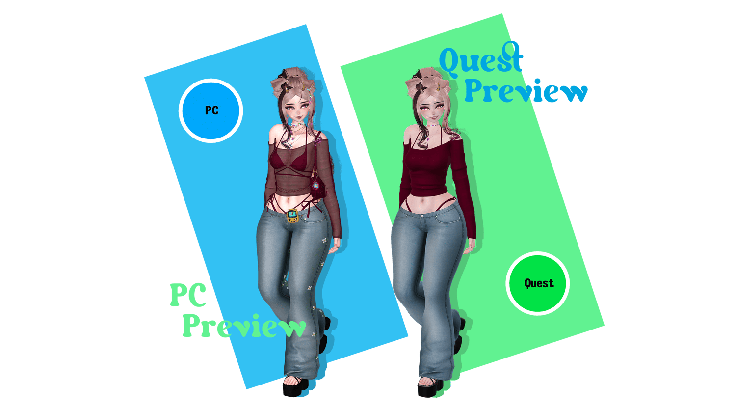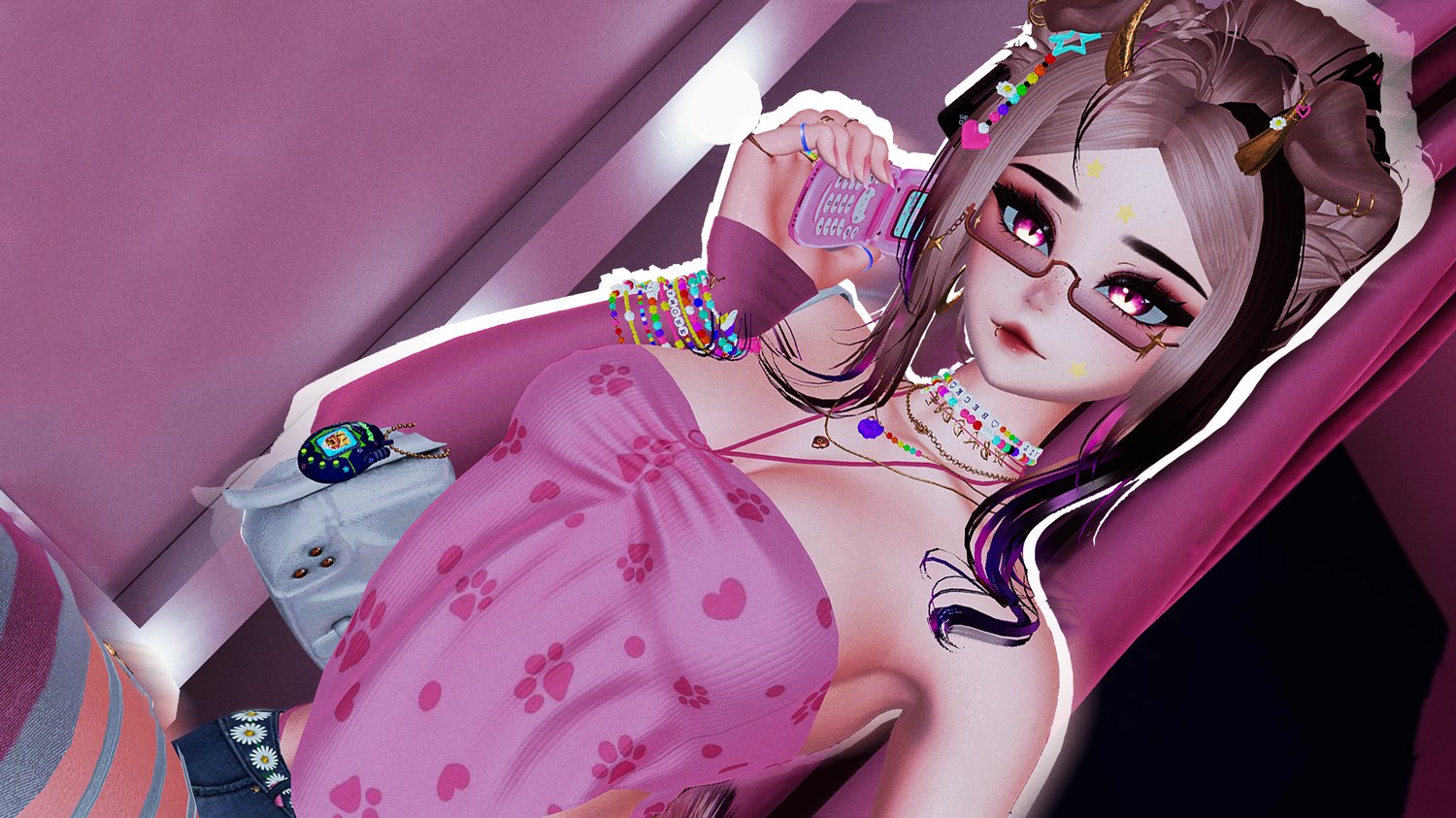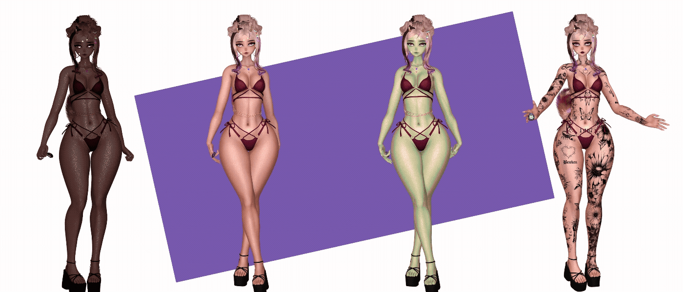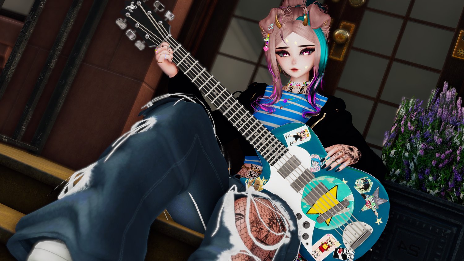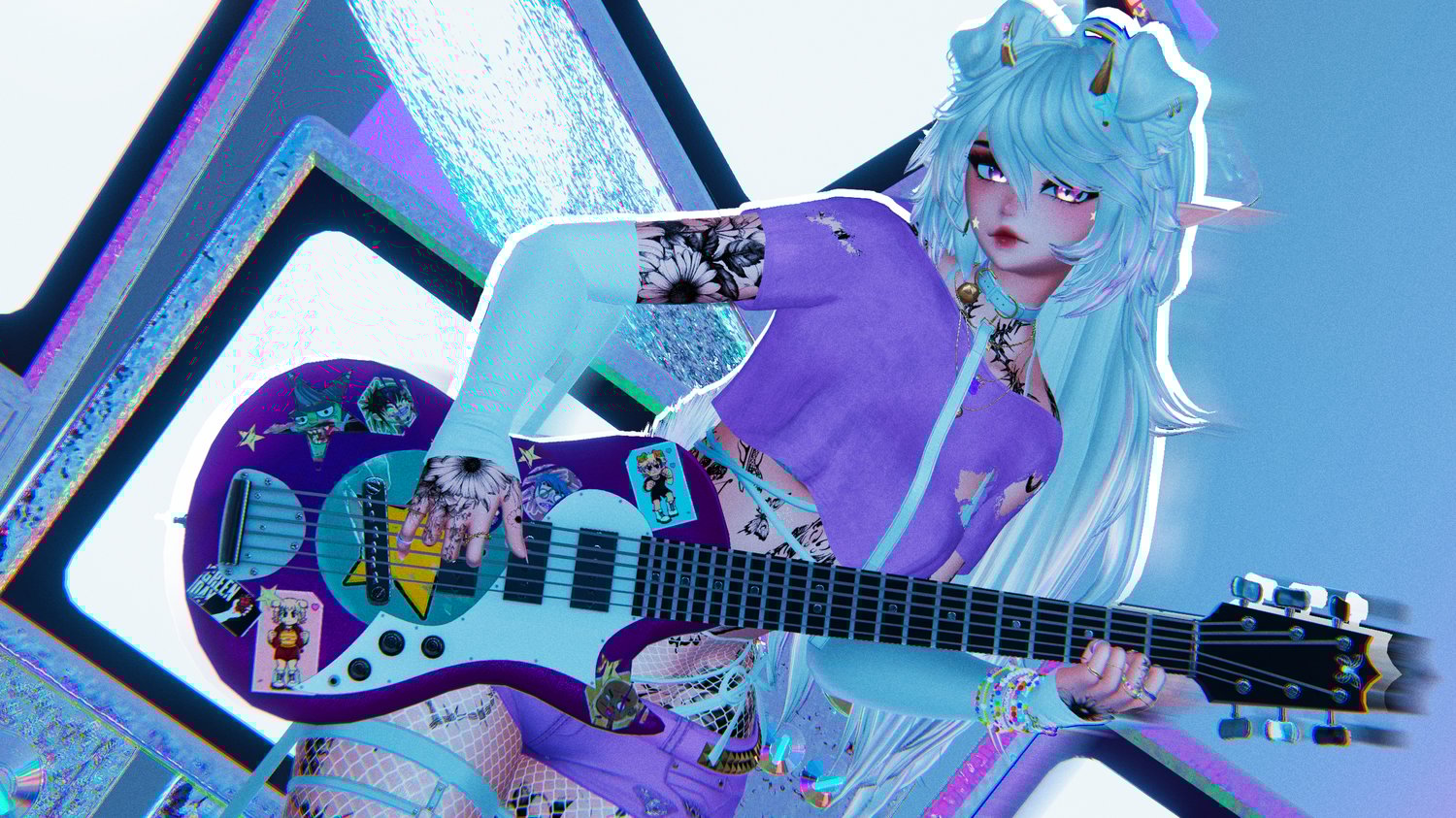Egirl Body: Zinpia/Sugs (edit by Khihani) • Head: Starlynn (edit by Khihani) • Lashes & Brows: Sivka • Facetexture & Skintexture: ying.vr • Eyetexture & Freckletexture: Missymod Nitro • Makeup Texture: MurderMothMarket • Tattoo Texture: Vinzo & Dyzzy • Star Stickers: GM's Box • Hair 1, 2, 3, 4, 5, 6: Saikura, Nessy, Minki • Hairtexture: Saikura, Cicieaaa • Sweatpants: Nikkiepng • Baggy Jeans, Skirt & Sleeves: Lolo • Crop Shirt: Kianvrc • Flipphone, Ripped Jeans & Charm Accessories: GelwO • Cat Ears & Tail, Rings, Waistchain, Piercing: Loki's Vanity • Shorts, Tighhighs, Sneaker: Skeletib/Tilly • Glasses, Choker, Bra, Panties & Heels: Zinpia • Platform Sandals: Kri • Cassette Player: Commission by Crozzie • Follower & Plushie: Commission by Soleia • Guitar Mesh: House of Heretics • Playable Guitar LodsGalaxy • Kleats: Nectar • Handbag, Earrings, Heartnecklace and Rings: Custom by Khihani • Comfy Sweater: Bunisu • Headphones: Nuusix • Crop Hoodie & Tshirt: Strelizias • FlipFlops: Dinzee • Y2K Tube Top: Moobean • Beret: Hayweee • Sheer Shirt, Heeled Boots & Long Sleeve Shirt: Saikura • Fishnet Texture: Boovr • Leash, Puppy Ears & Tail: Jinxiewinks • Portable Boombox: DittyDos (Commercial use permitted) • Star Trails: Xxuebi • Flowertrails: Kisustar • SPS Setup: Wholesome • Heart Particles: Bunky • GoGo locomotion: franada#0001 • Star Noseboop & Environment Particles: Commission by Phawksea • Showcase, Texturing, promotion material, marketing, emotional support: Dyzzyvr • Photos: Blazeytaco, Bentai, LightIceQueen